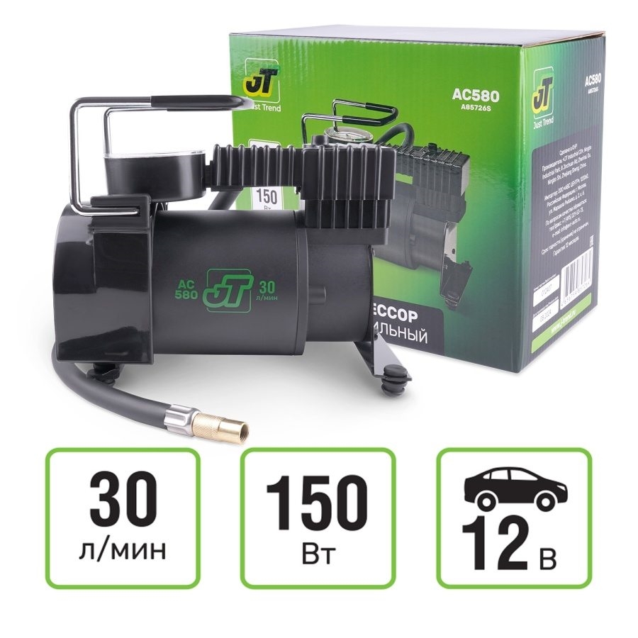Автомобильный компрессор JT "AC580" предназначен для накачки воздухом шин легковых и коммерческих автомобилей, мячей и матрасов.