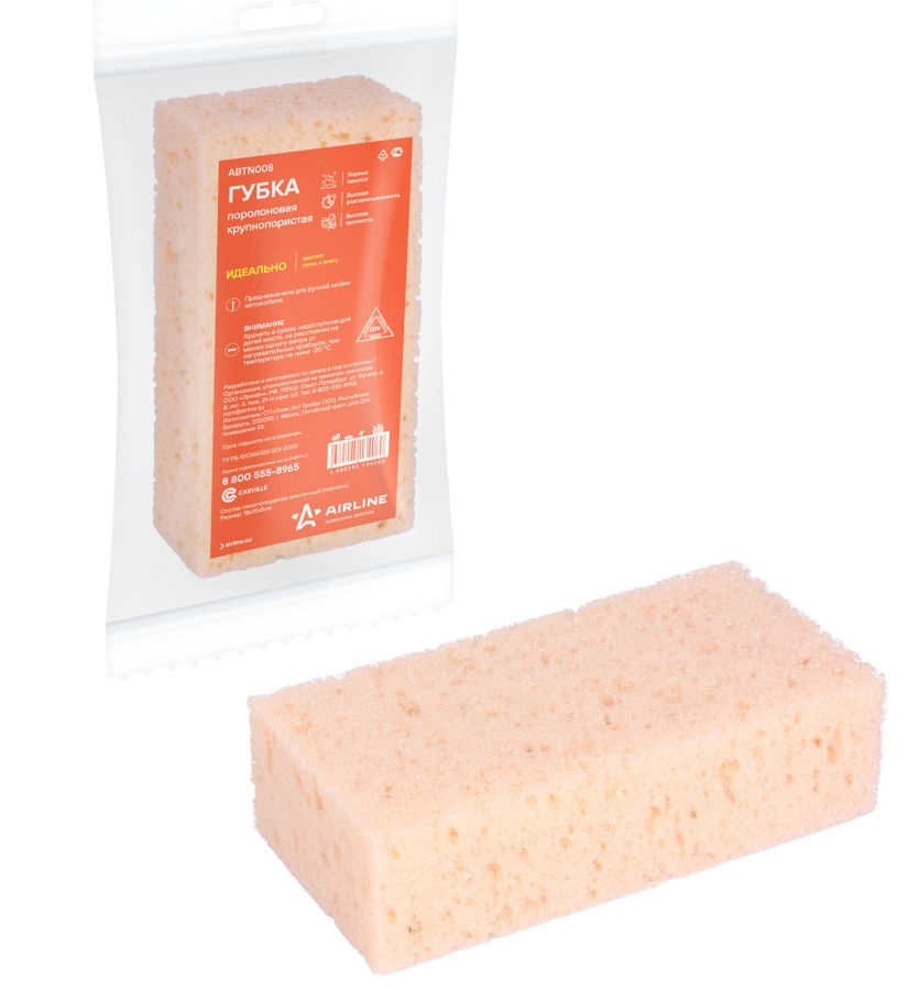 Губка поролоновая крупнопористая AIRLINE предназначена для ручной мойки автомобиля. Обладает повышенной прочностью, высокой влаговпитываемостью, хорошо пенится.