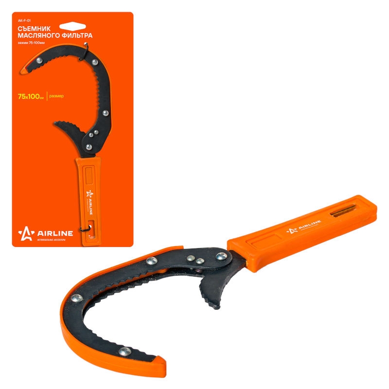 Инструмент поможет произвести демонтаж масляного фильтра автомобиля. Конструкция для съема фильтра представлена в виде зажима, с помощью которого закрепляется деталь. Съемник изготовлен из металла и прочного пластика. Размер зажима равен 75-100 мм. Ручка имеет ярко-оранжевый фирменный цвет AIRLINE, а рабочая часть изделия окрашена в черный.